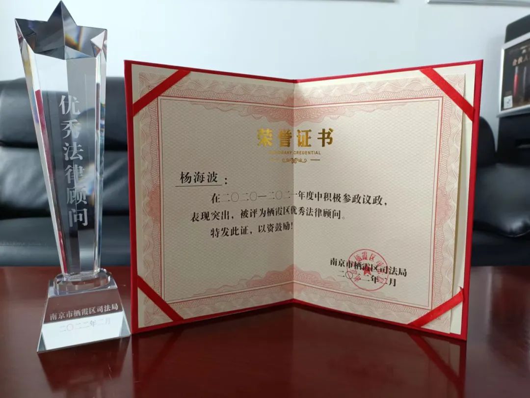 同时,我所戴垚律师获得栖霞区“年度优秀律师”,杨海波同志获得栖霞区“年度优秀法律顾问”,行政主管位士良获得栖霞区“年度优秀行辅工作者”。