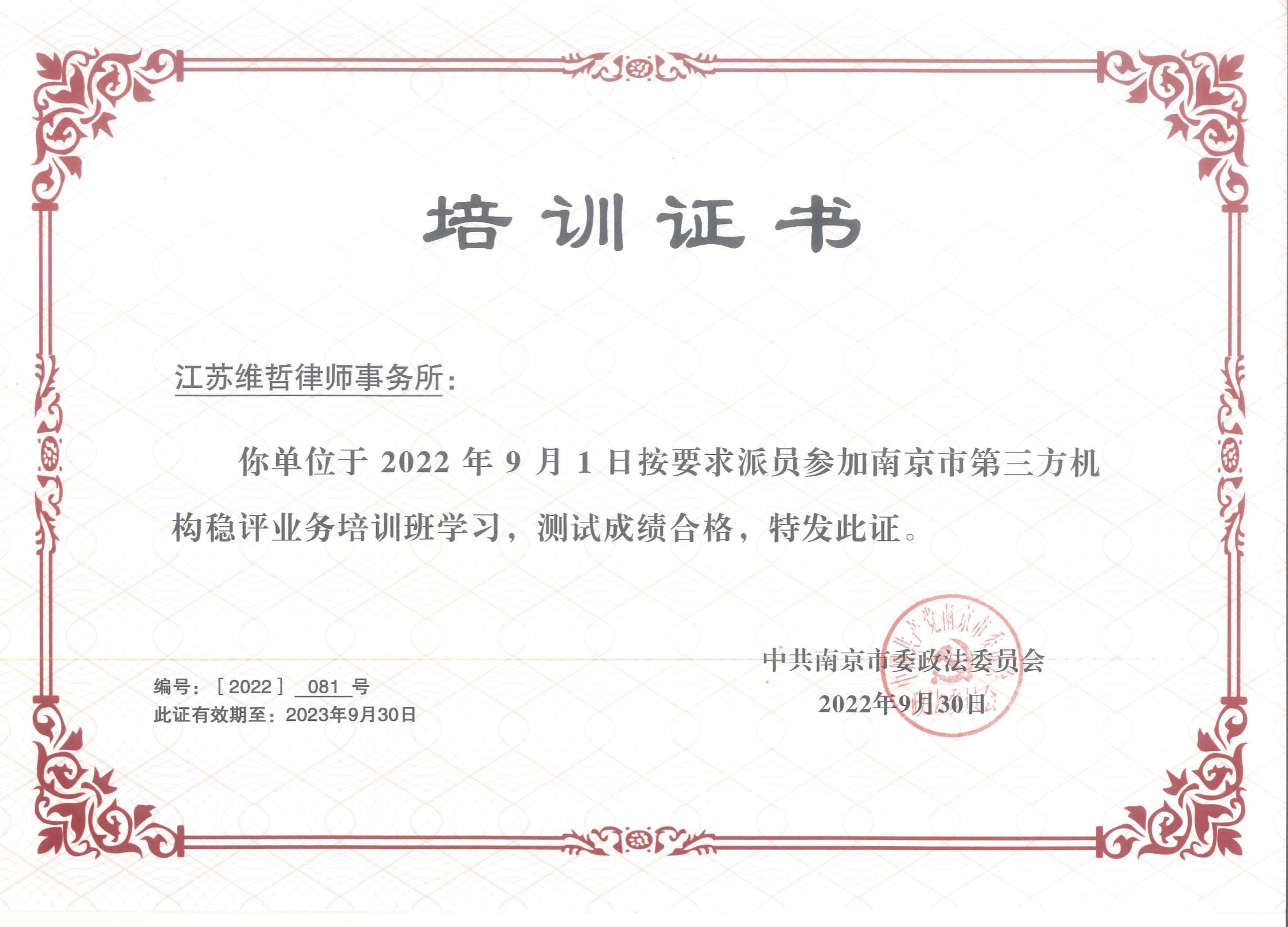 社会稳定风险评估是个新生事物,本次获得社会稳定风险评估资质,对维哲所来说既是一种机遇,也是承担社会责任、为党委政府重大决策保驾护航的重要抓手。下一步,维哲所将继续以专业的水平、专注的态度、专心的服务,为党委政府的重大决策提供坚实的法律保障,为维护社会的和谐稳定作出更大的贡献,为建设“法治南京”贡献出“维哲”力量。